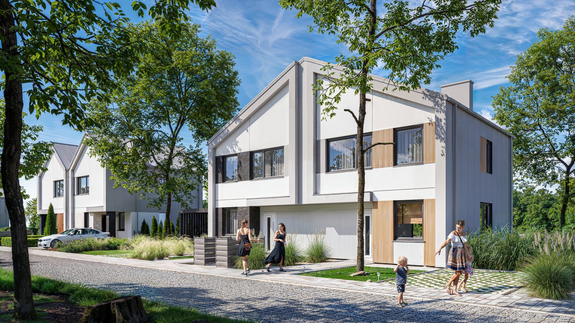 Wizualizacje zostały zaprojektowane tak, aby jasno komunikować charakter osiedla i pomagać klientom wyobrazić sobie codzienne funkcjonowanie w nowej przestrzeni.