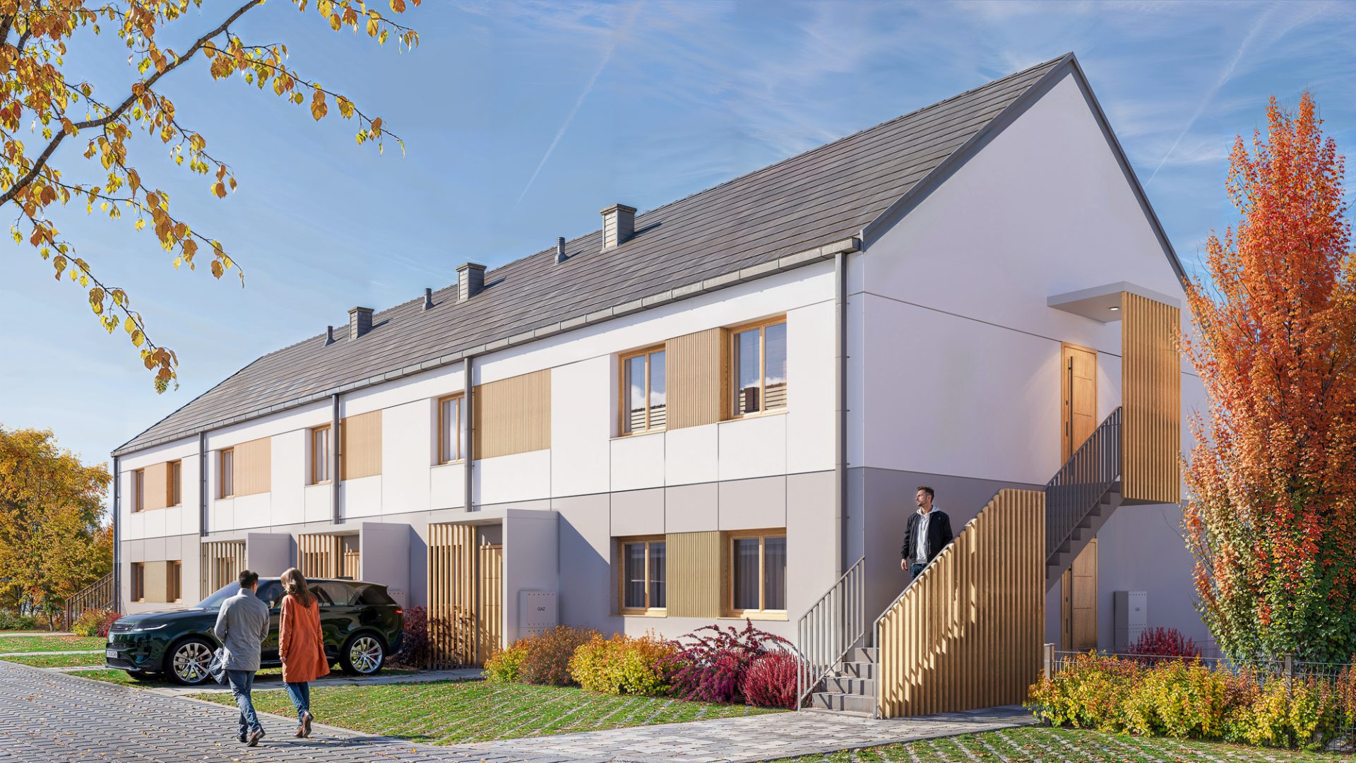 Wizualizacje architektoniczne – prezentujące eleganckie bryły domów w zabudowie bliźniaczej, z wyraźnym podkreśleniem naturalnych materiałów i nowoczesnego designu.