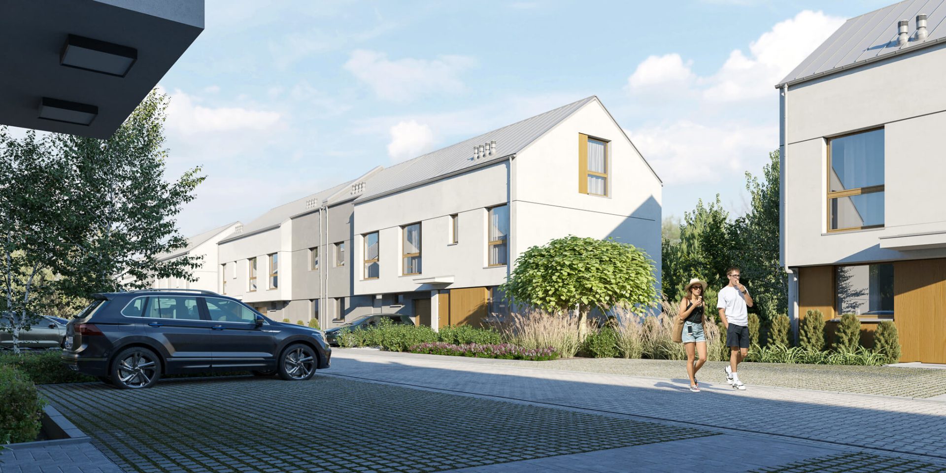 Przygotowane przez nas wizualizacje prezentują inwestycję jako harmonijną i funkcjonalną przestrzeń stworzoną z myślą o komforcie przyszłych mieszkańców. Spokojna kolorystyka, nowoczesna forma oraz otaczająca zieleń budują spójny charakter osiedla.